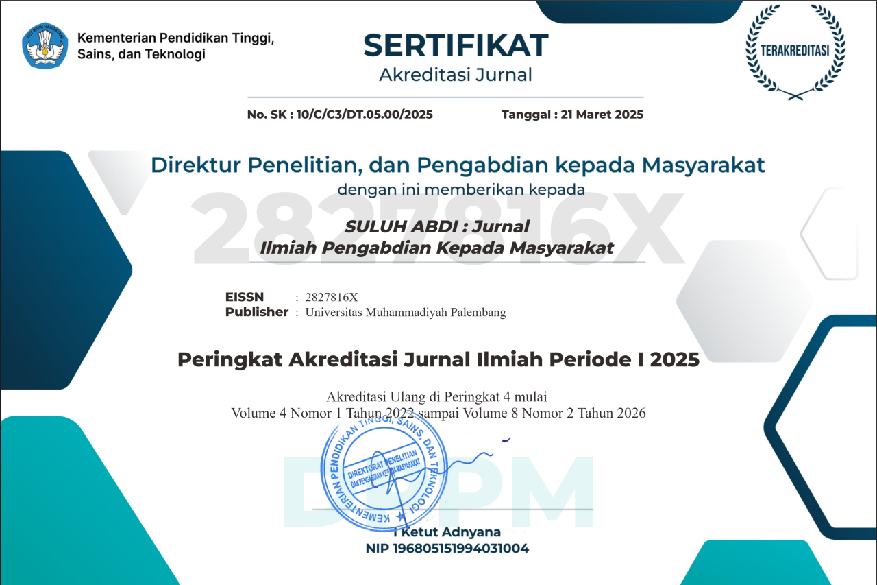 Suluh Abdi : Jurnal Ilmiah Pengabdian Kepada Masyarakat, dengan ISSN online 2827-816X dan ISSN cetak 2685-9688 diterbitkan oleh Lembaga Penelitian dan Pengabdian Kepada Masyarakat (LPPM) Universitas Muhammadiyah Palembang. Ini adalah jurnal berkala dua kali setahun yang ditelaah sejawat dan berfokus pada praktik dan proses keterlibatan masyarakat dan sebagai forum bagi akademisi, praktisi, dan perwakilan komunitas untuk mengeksplorasi isu-isu dan merefleksikan praktik yang berkaitan dengan berbagai aktivitas terlibat. Jurnal ini didedikasikan untuk publikasi penelitian berkualitas tinggi yang berfokus pada penelitian dan implementasi dari kegiatan pengabdian kepada masyarakat. Suluh Abdi saat ini terakreditasi SINTA 4 berdasarkan Surat Keputusan Direktur Jenderal Pendidikan Tinggi, Riset, Dan Teknologi Kementerian Pendidikan, Kebudayaan, Riset, Dan Teknologi Republik Indonesia Nomor (status pada arjuna masih dalam progres pembuatan Sertifikat Akreditasi ) (Download SK). Telah ditetapkan pada Maret 2025 keputusan Hasil Penilaian Akreditasi.